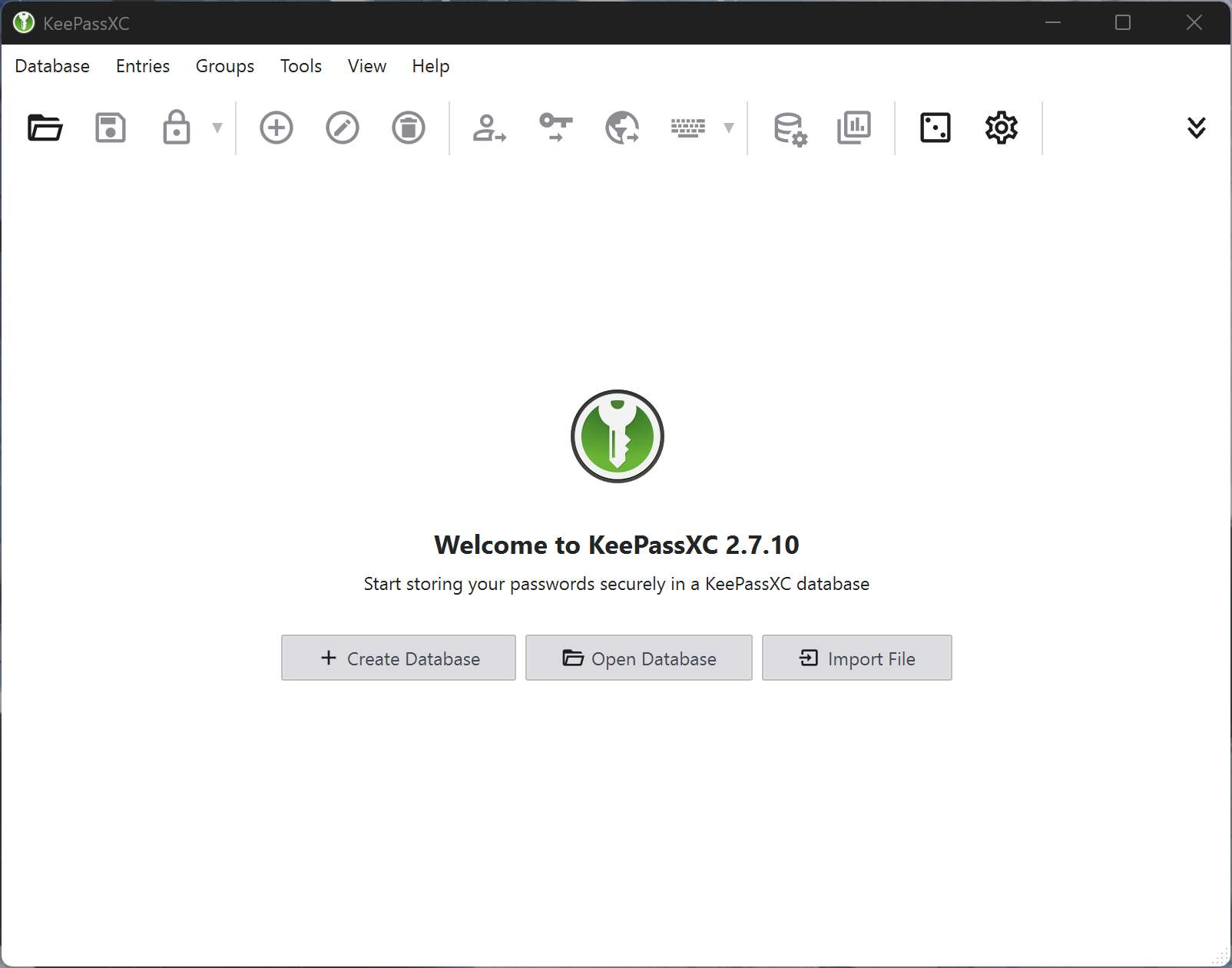 When the KeePassXC password manager is started for the first time after the initial installation, a password database file must be created using the + Create Database button.