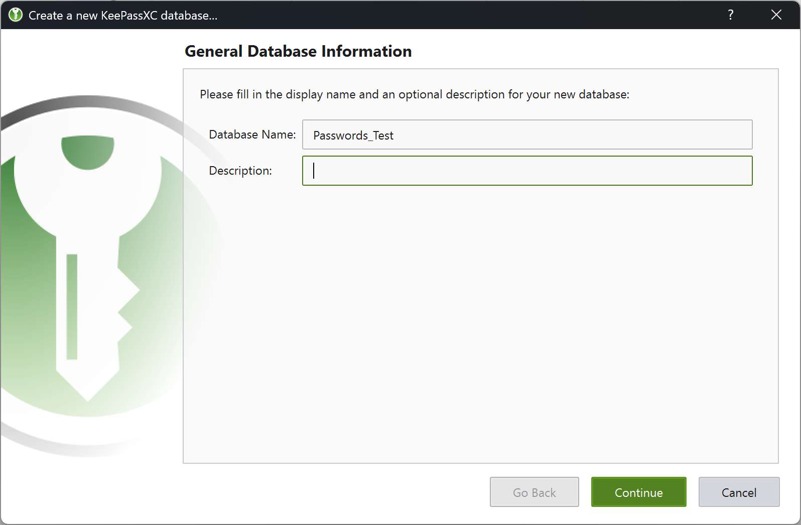 First, you are asked for a name for the database file. A description of the file can then be entered if required.