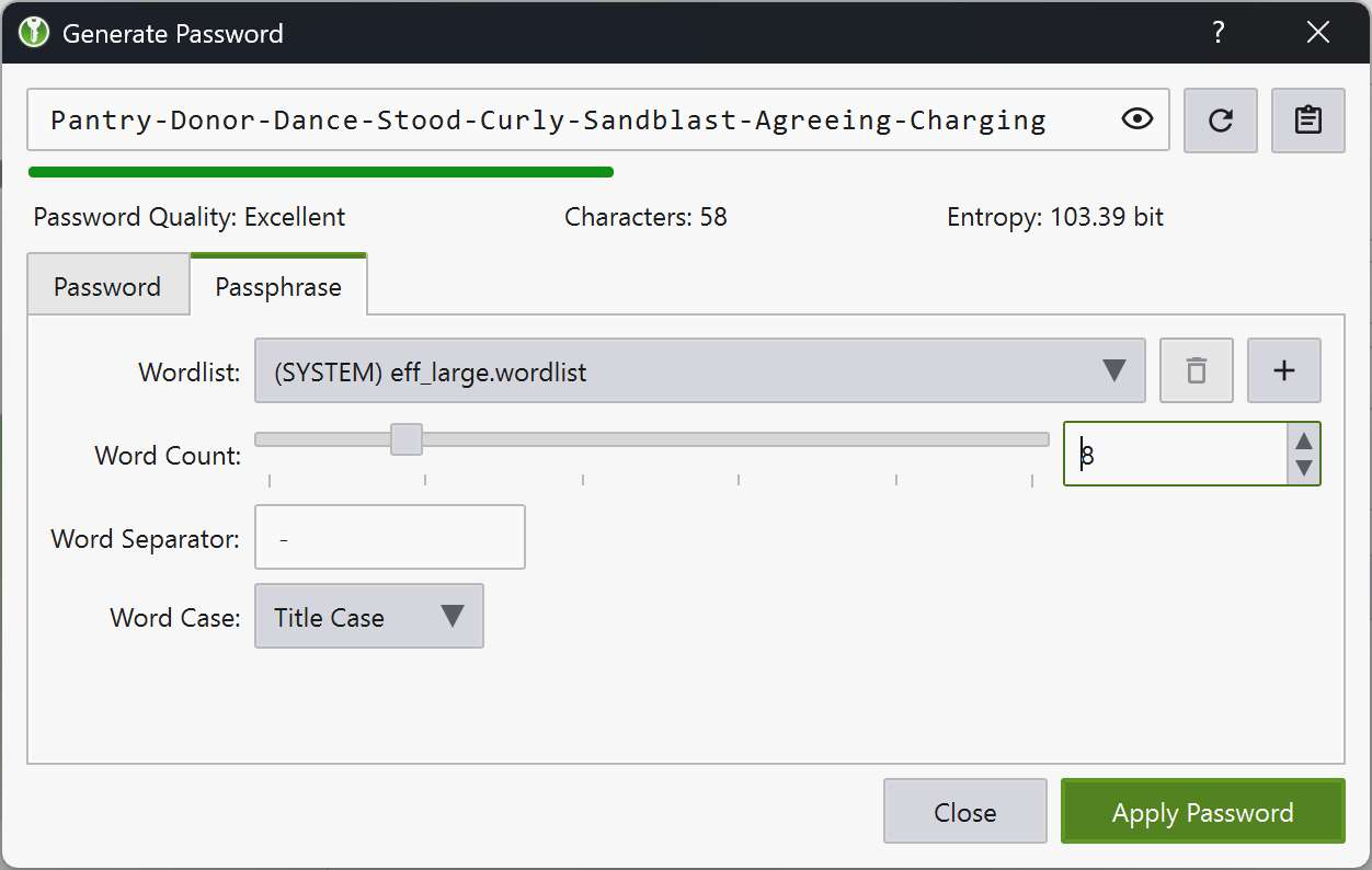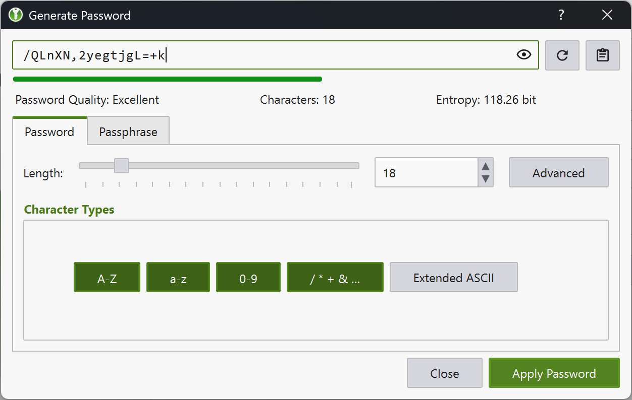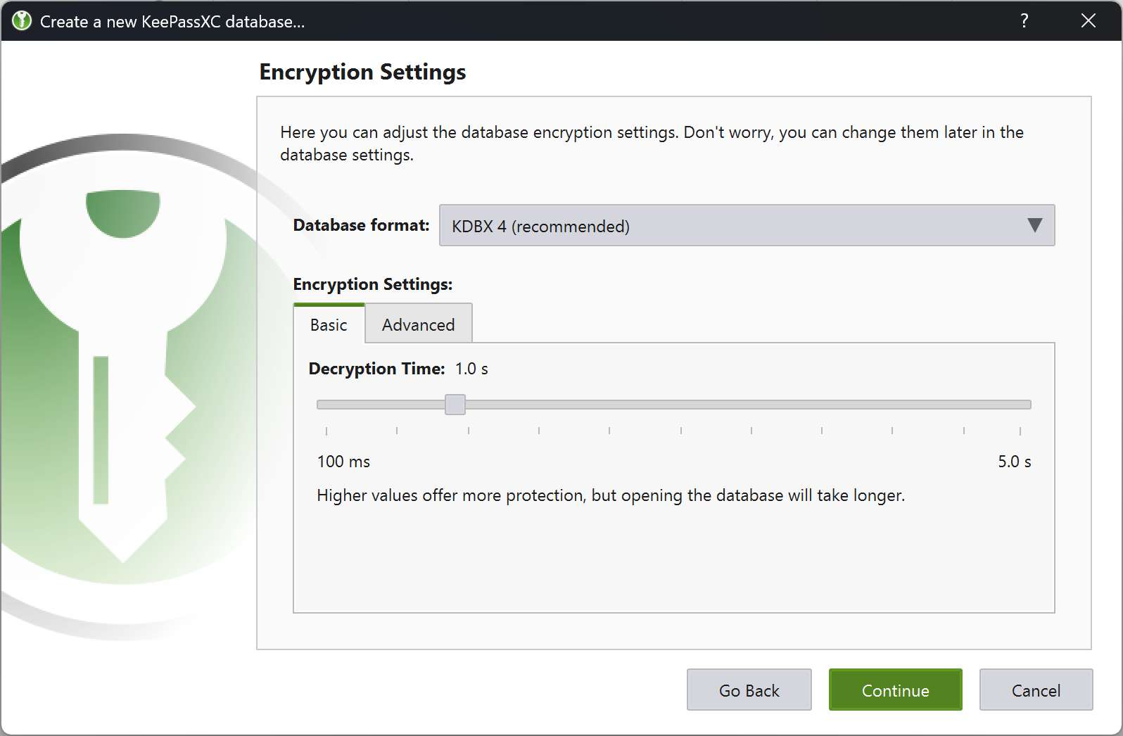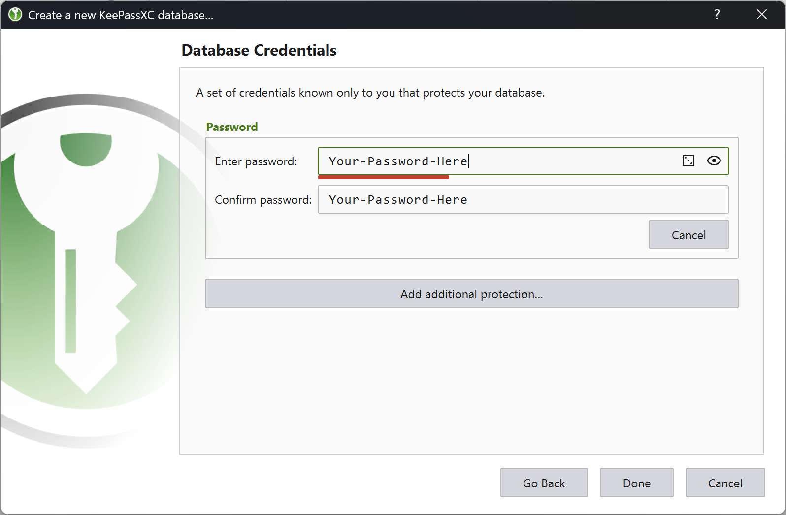 This step involves assigning a password, which is required to open the database file. You can generate a password by clicking on the die symbol.