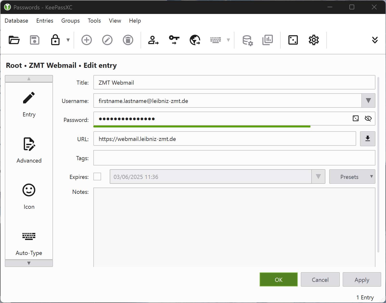 You can enter a title for the entry, as well as the user name, password and the URL of the website.